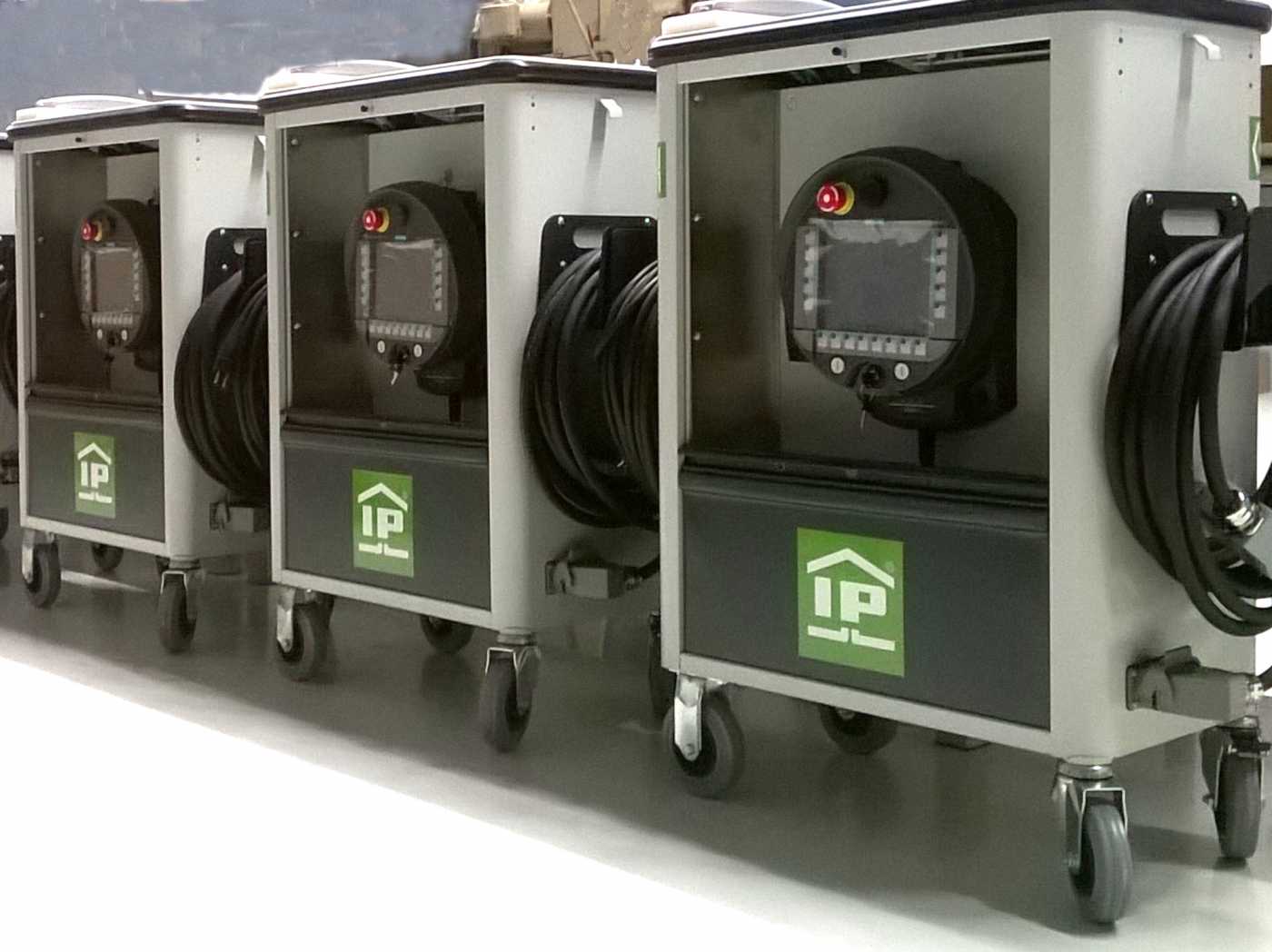 Die Steuereinheit ist in eine mobile Werkbank integriert. Vier Vollgummirollen ermöglichen ein einfaches Verfahren des Geräts im Betriebsumfeld.